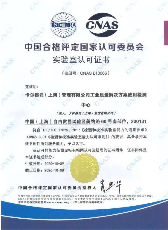 近日,卡尔中山蔡司(上海)管理有限公司工业质量解决方案应用检测中心经过中国合格评定国家认可委员会(CNAS)严格的现场评审和后续考察,正式通过了最终审评并获得实验室国家认可证书。至此,标志着蔡司应用检测中心具有了国家及国际认可的管理水平和校准能力。